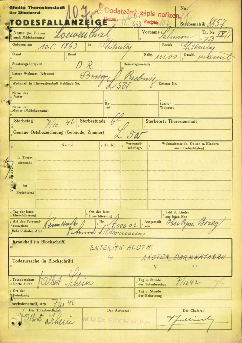 Löwenthal Salomon: Death certificate, Ghetto Terezín