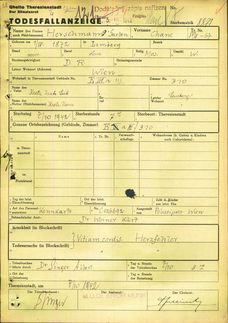 Herschmann Anna Chane: Death certificate, Ghetto Terezín