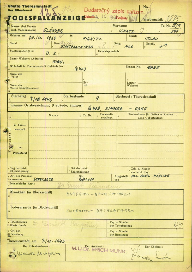 Glässer Ignatz: Death certificate, Ghetto Terezín