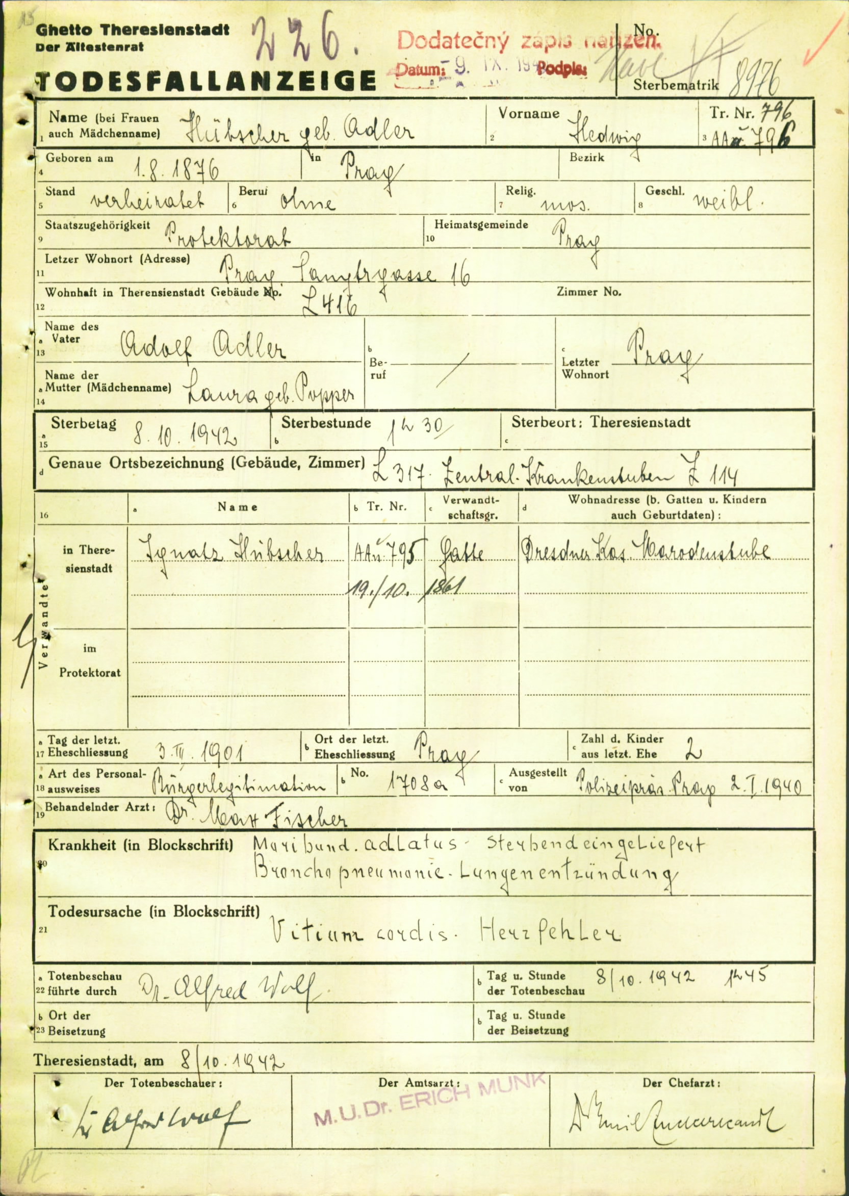 Hübscherová Hedvika: Death certificate, Ghetto Terezín