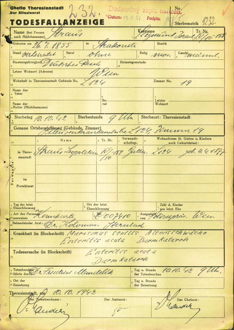 Strauss Sigmund: Death certificate, Ghetto Terezín