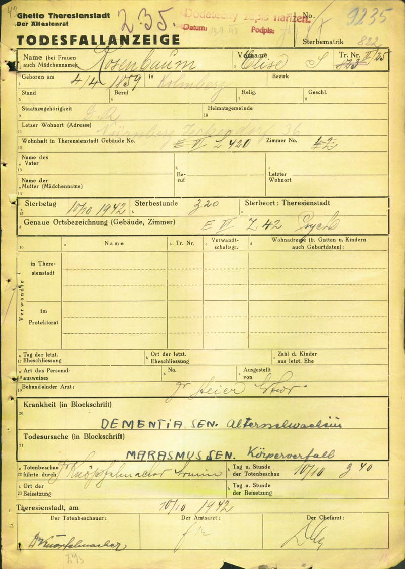 Rosenbaum Elise: Death certificate, Ghetto Terezín