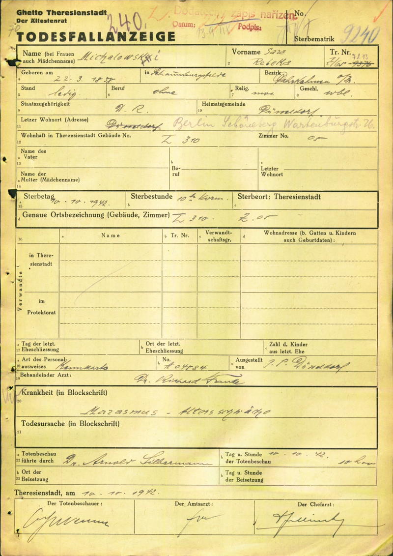 Michalowski Rebeka: Death certificate, Ghetto Terezín