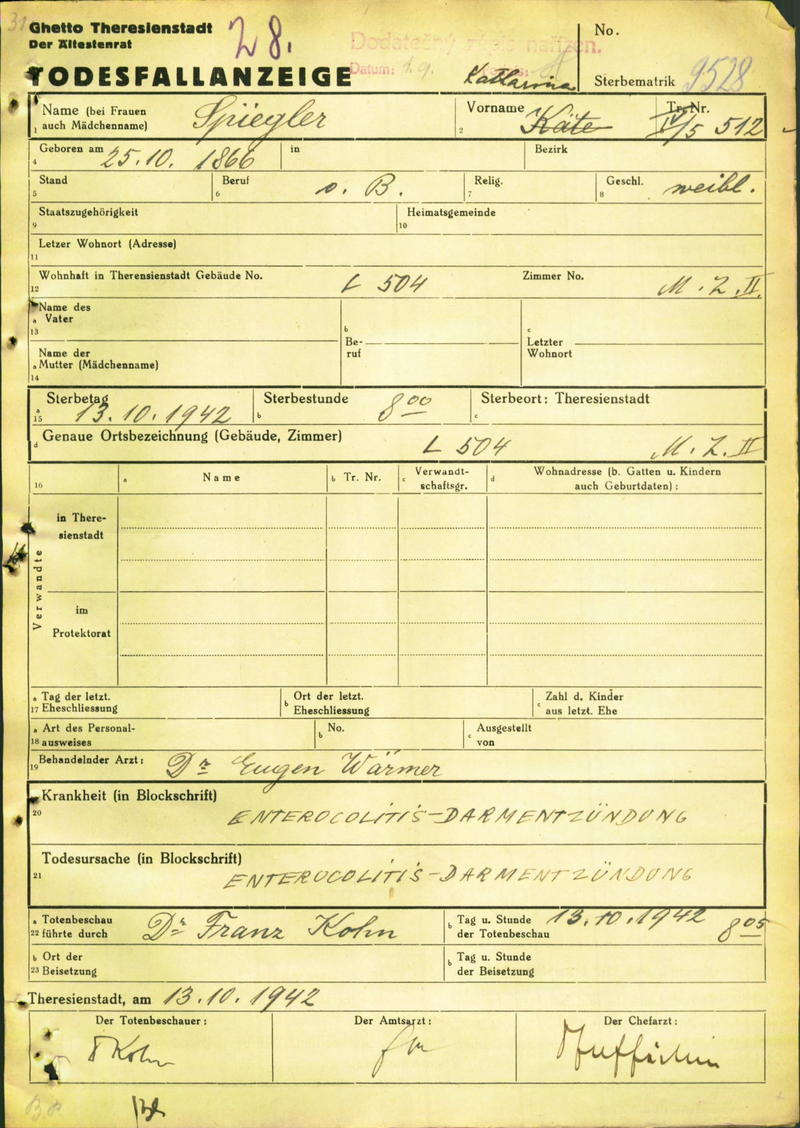 Spiegler Katharina: Death certificate, Ghetto Terezín