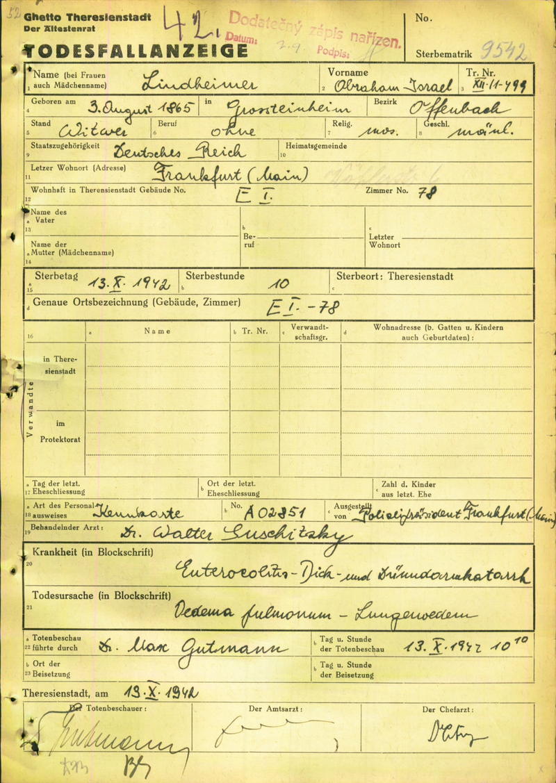 Lindheimer Abraham: Death certificate, Ghetto Terezín