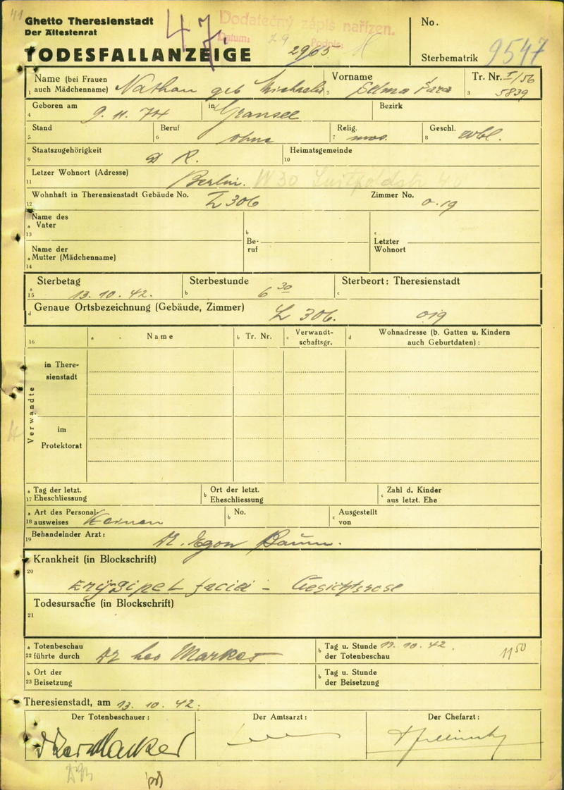Nathan Selma: Death certificate, Ghetto Terezín