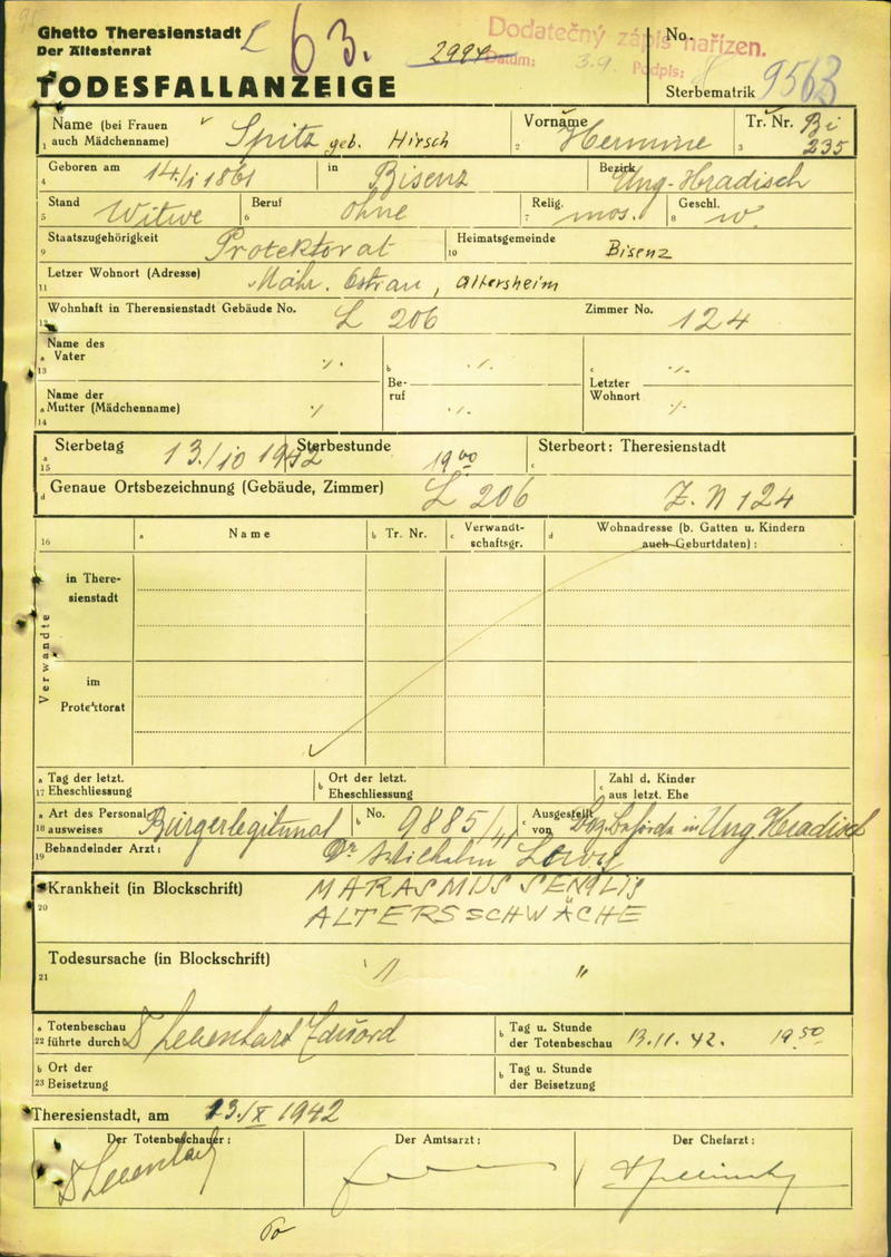 Spitzová Hermína: Death certificate, Ghetto Terezín