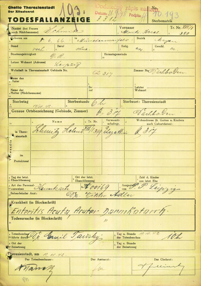 Schmitz Moritz: Death certificate, Ghetto Terezín