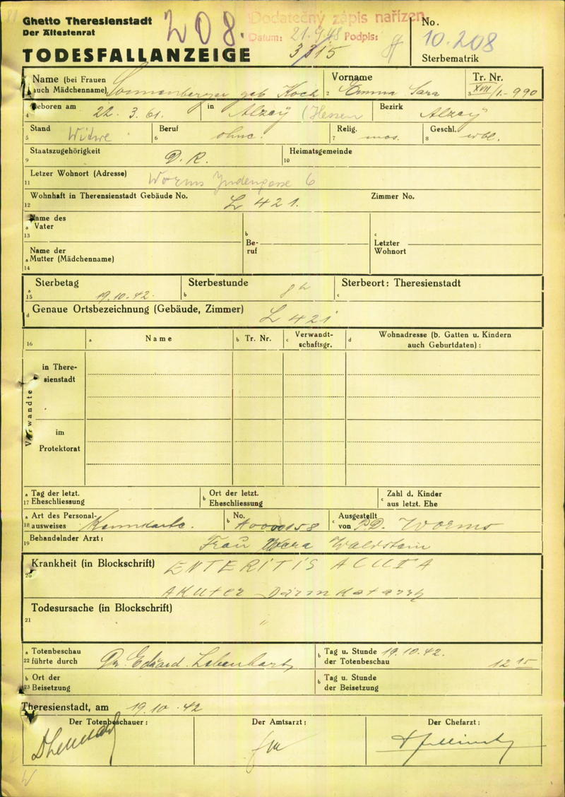 Sonnenberger Emma: Death certificate, Ghetto Terezín