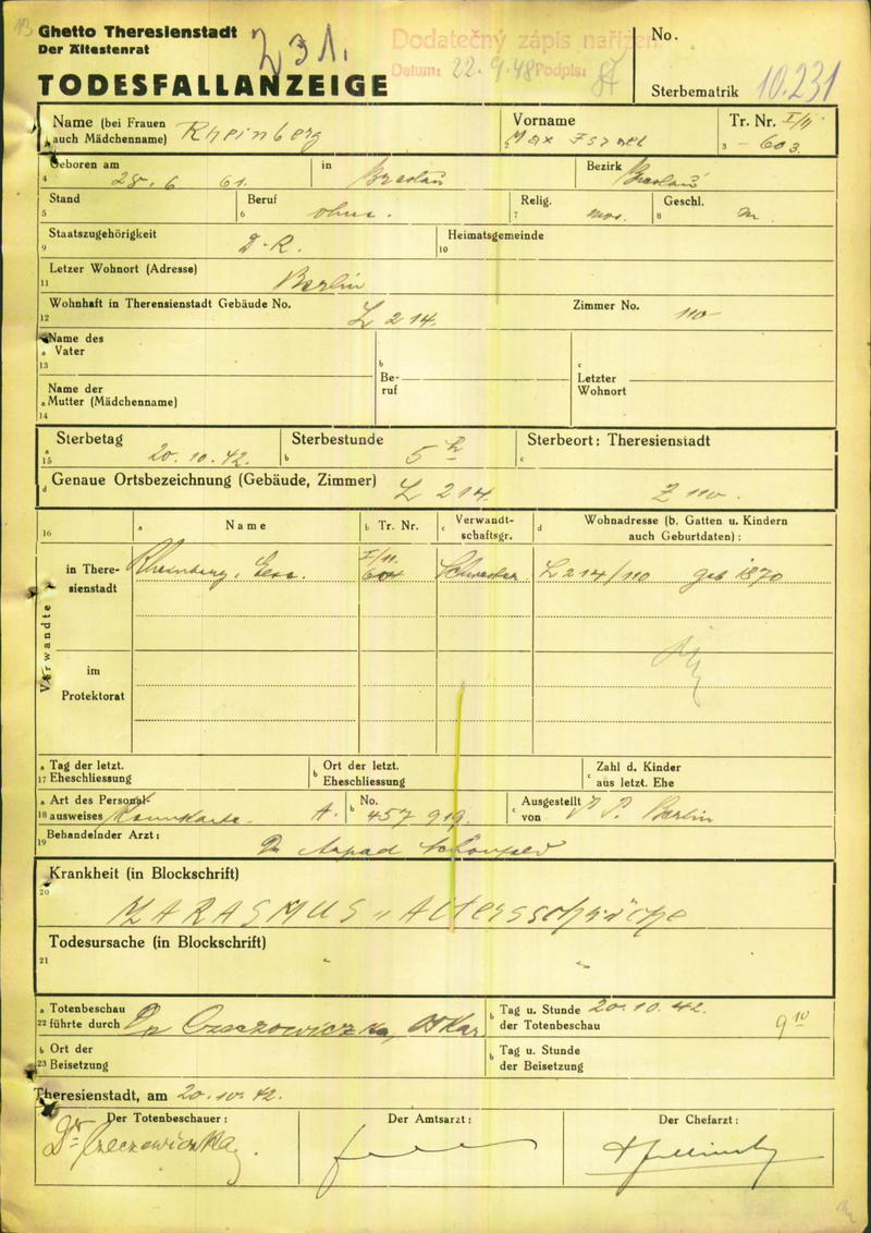 Rheinberg Max: Death certificate, Ghetto Terezín