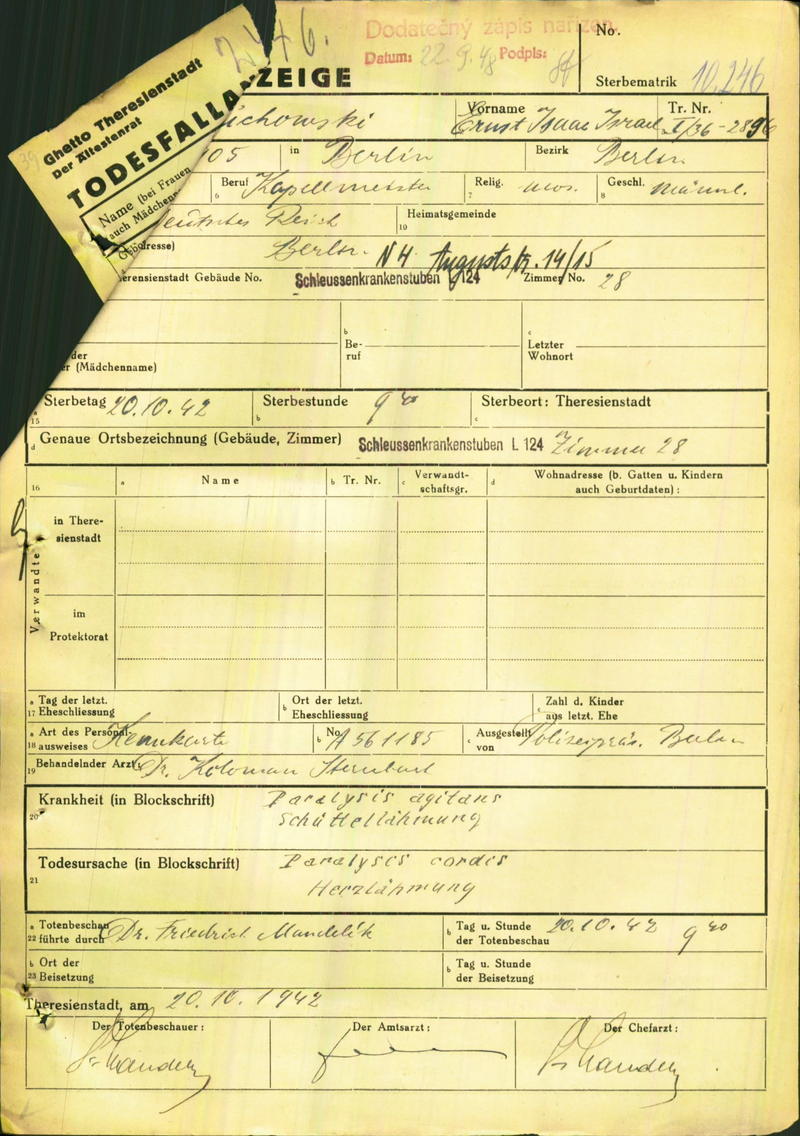 Petuchowski Isak Ernst: Death certificate, Ghetto Terezín