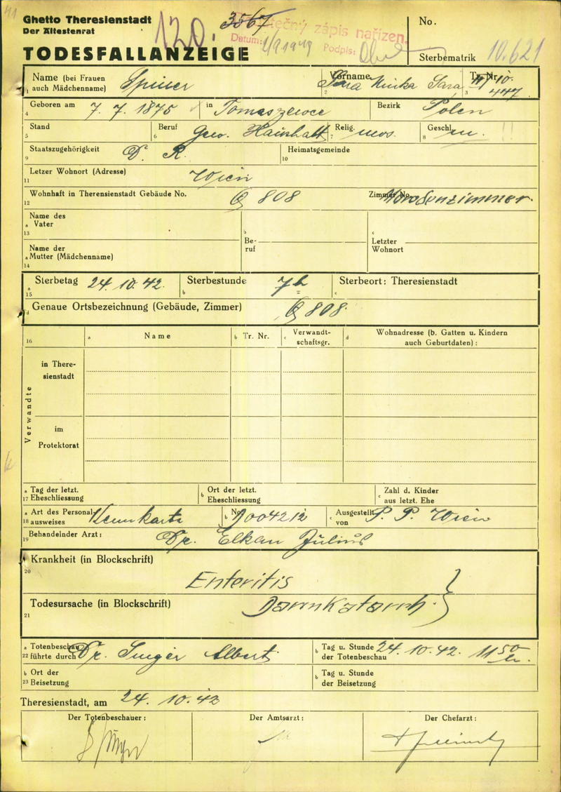 Spinner Minna: Death certificate, Ghetto Terezín