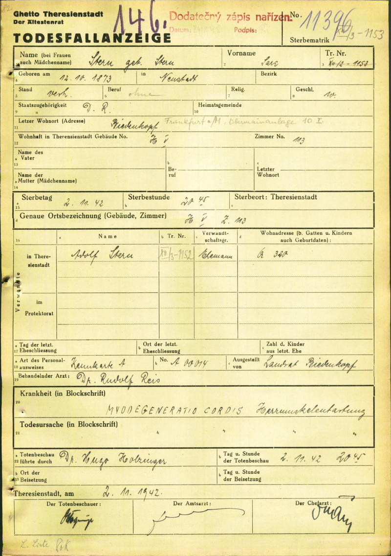 Stern Sara: Death certificate, Ghetto Terezín