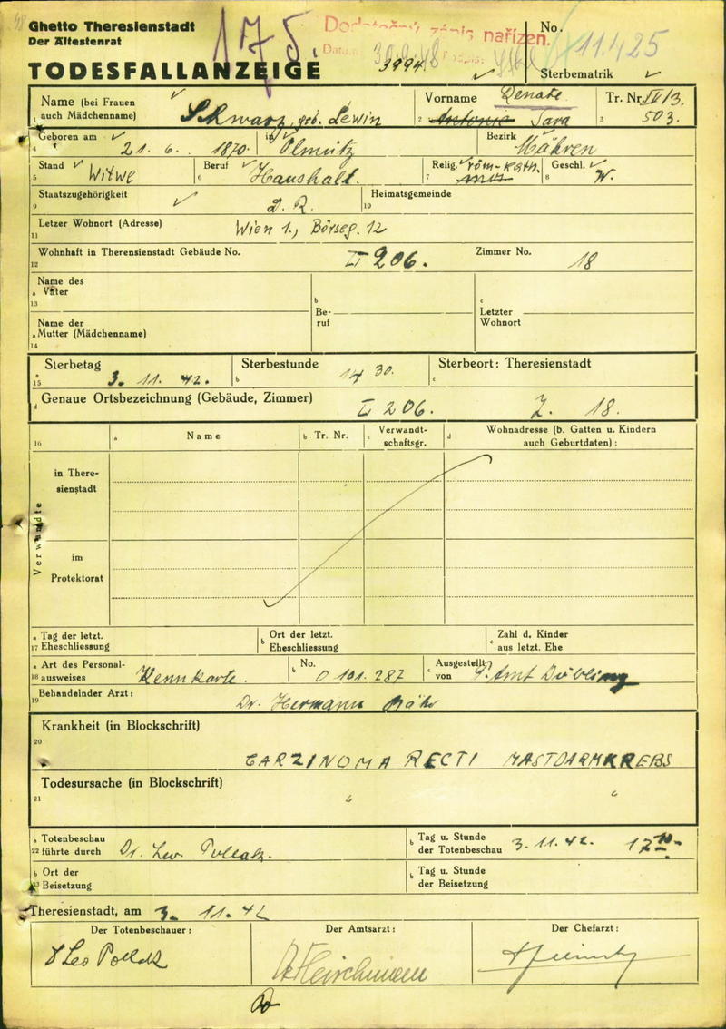 Schwarz Renate: Death certificate, Ghetto Terezín