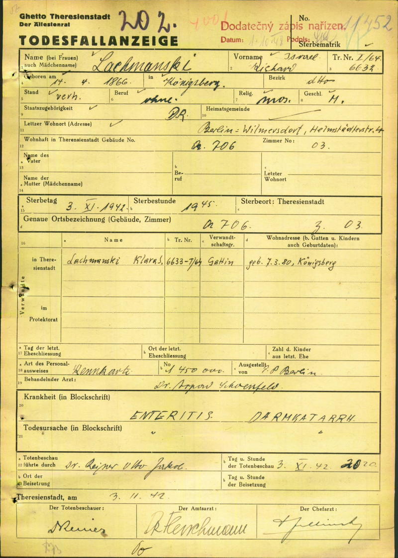 Lachmanski Richard: Death certificate, Ghetto Terezín