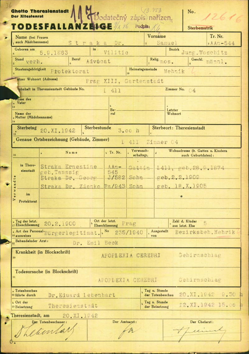 Straka Samuel: Death certificate, Ghetto Terezín