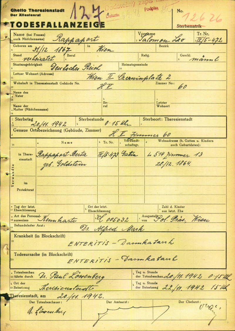 Rappaport Salomon Leo: Death certificate, Ghetto Terezín