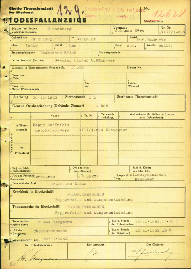 Hirschberg Johanna: Death certificate, Ghetto Terezín