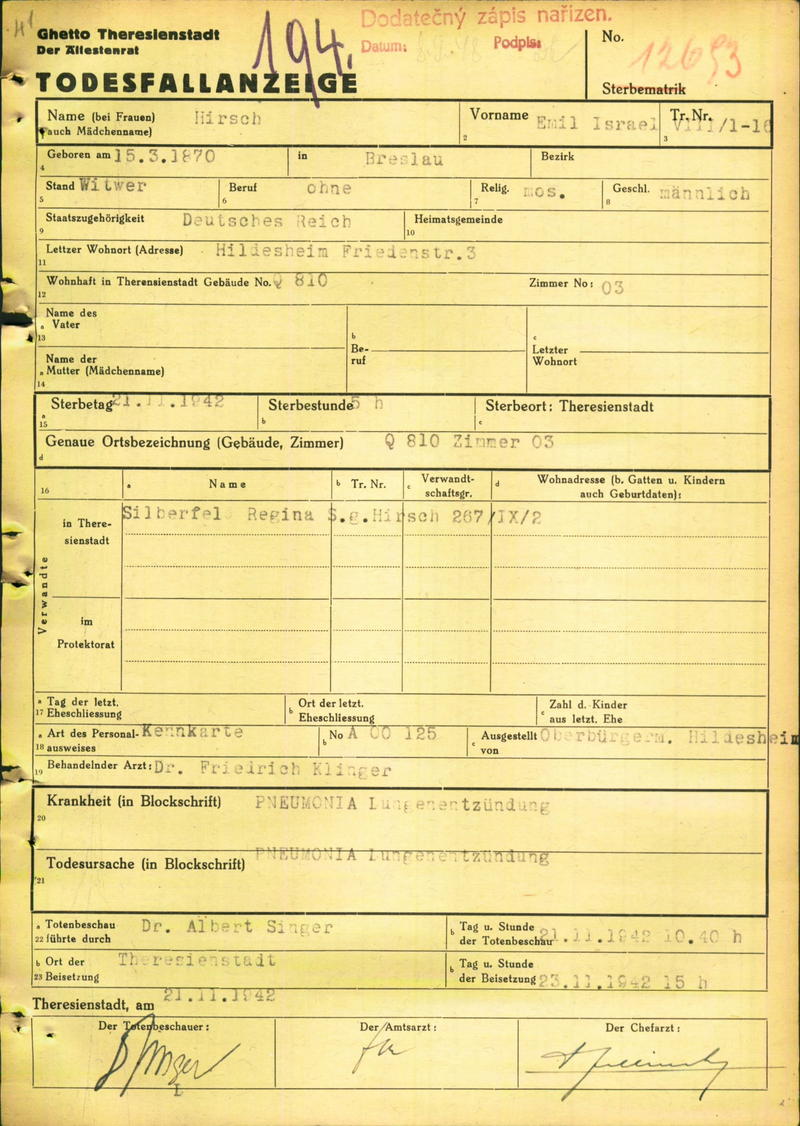 Hirsch Emil: Death certificate, Ghetto Terezín