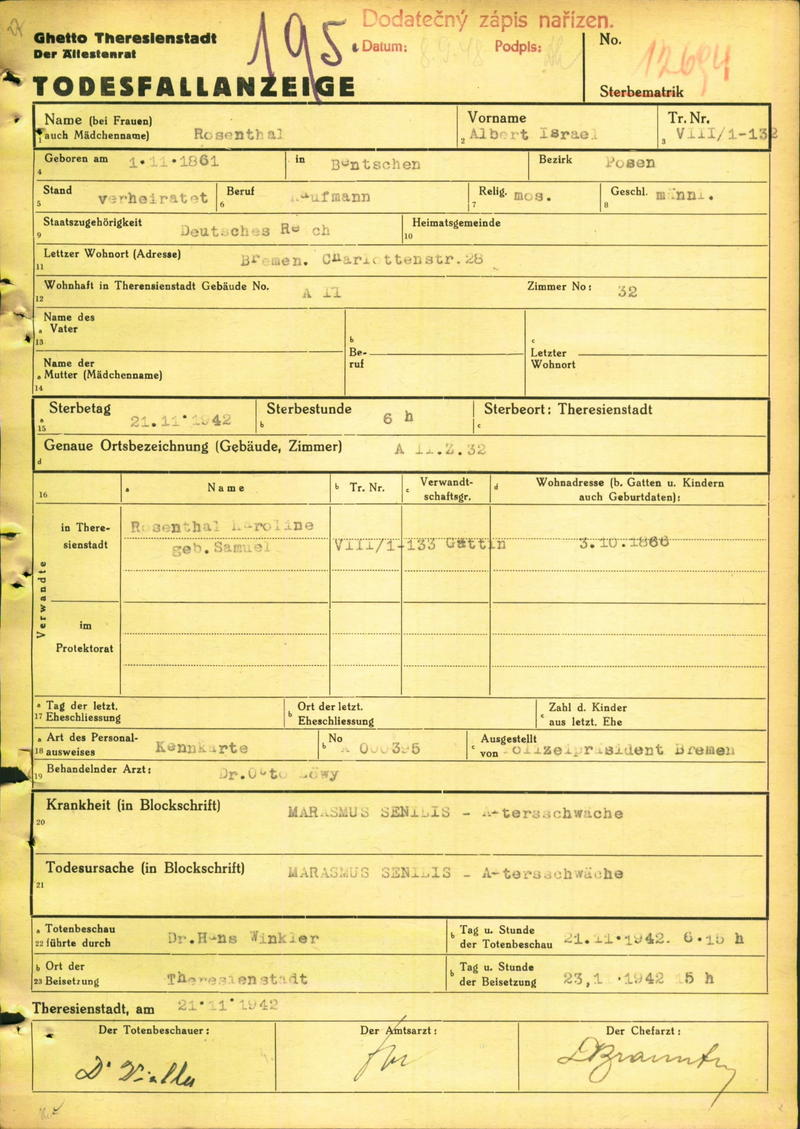Rosenthal Albert: Death certificate, Ghetto Terezín
