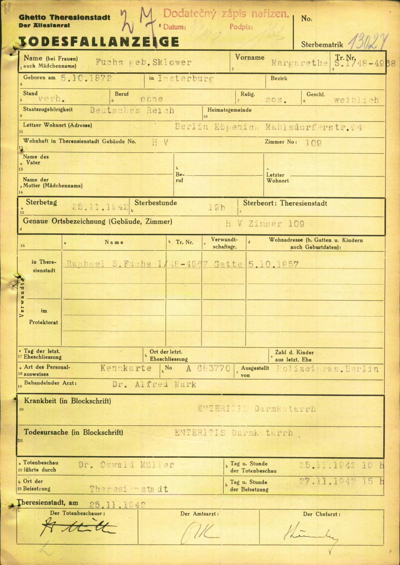 Fuchs Margarethe: Death certificate, Ghetto Terezín