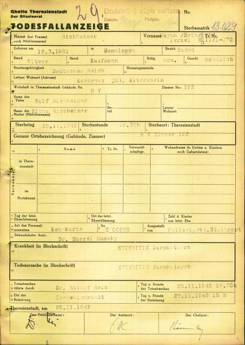Richheimer Heinrich: Death certificate, Ghetto Terezín