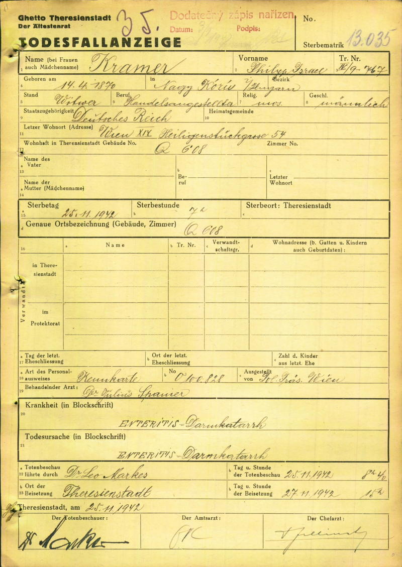 Kramer Philipp: Death certificate, Ghetto Terezín