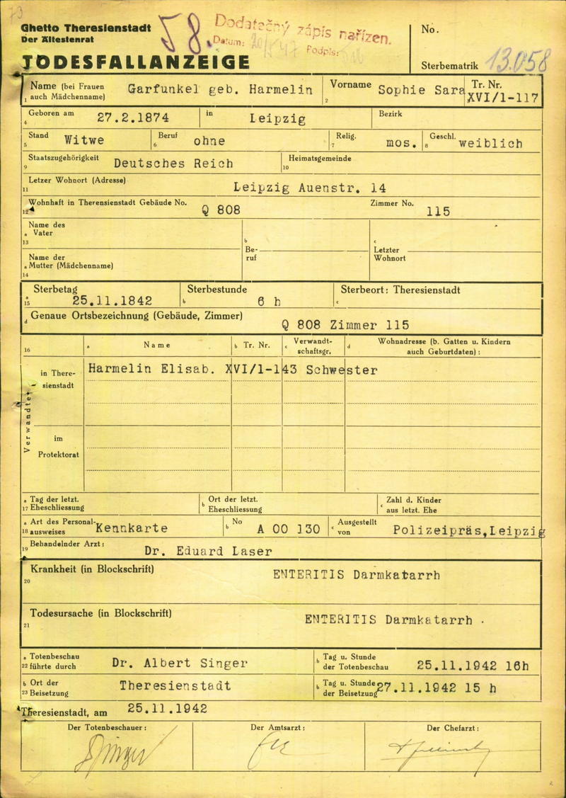 Garfunkel Sophie: Death certificate, Ghetto Terezín