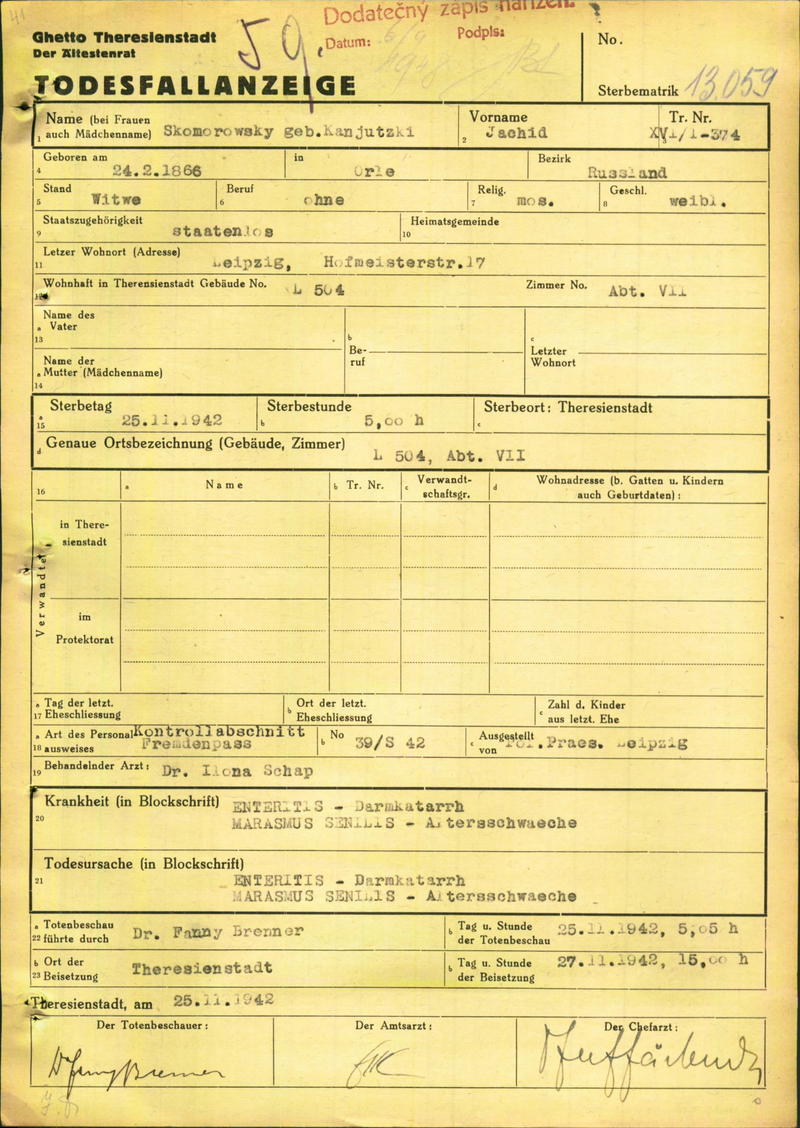 Skomorowsky Jachid: Death certificate, Ghetto Terezín