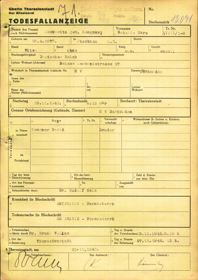 Lewkowitz Natalie: Death certificate, Ghetto Terezín