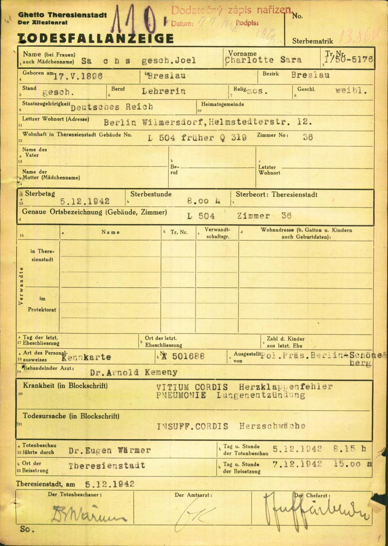 Sachs Charlotte: Death certificate, Ghetto Terezín