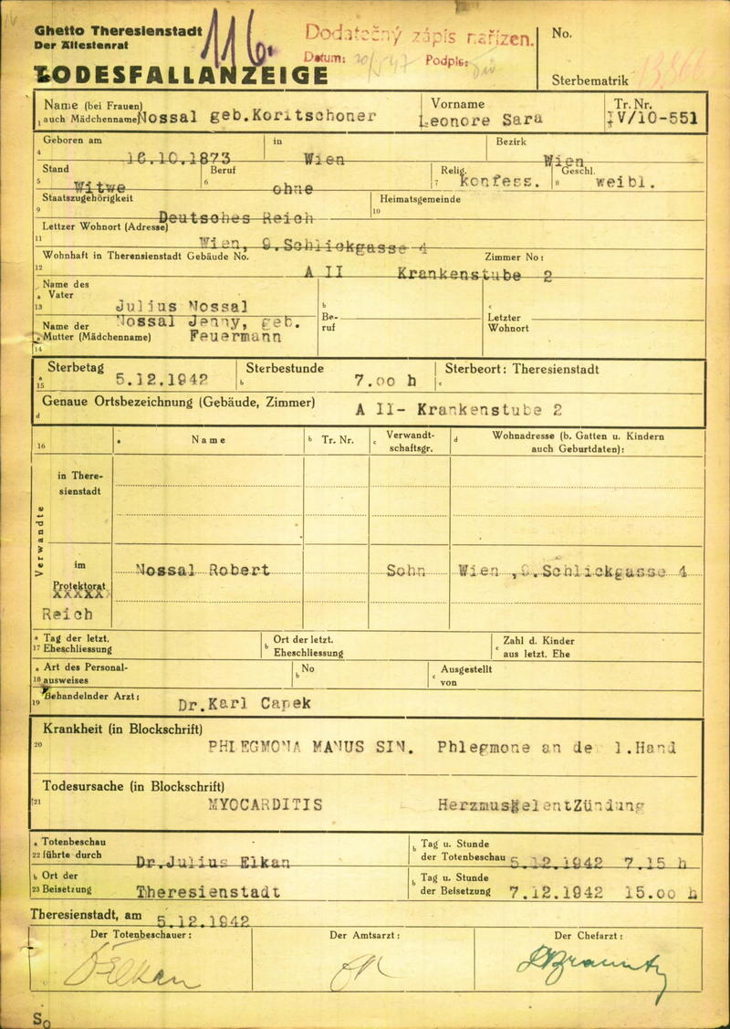Nossal Leonore: Death certificate, Ghetto Terezín