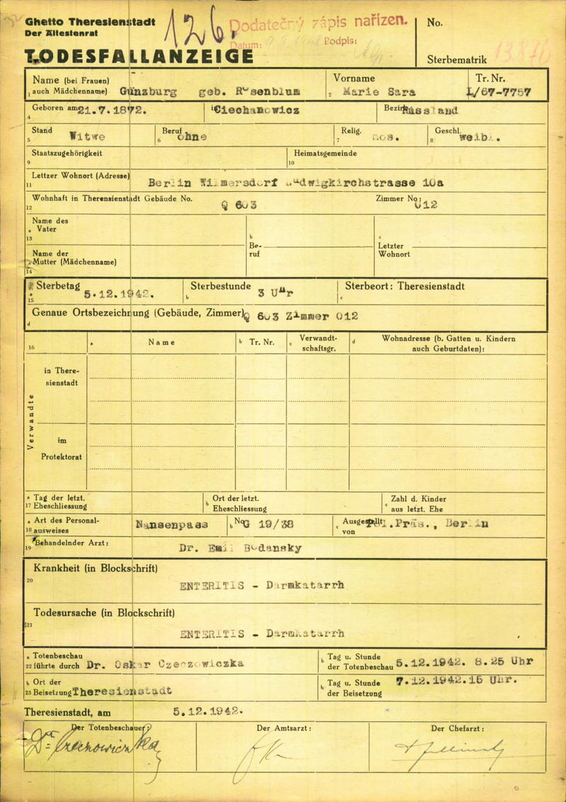 Günzburg Marie: Death certificate, Ghetto Terezín