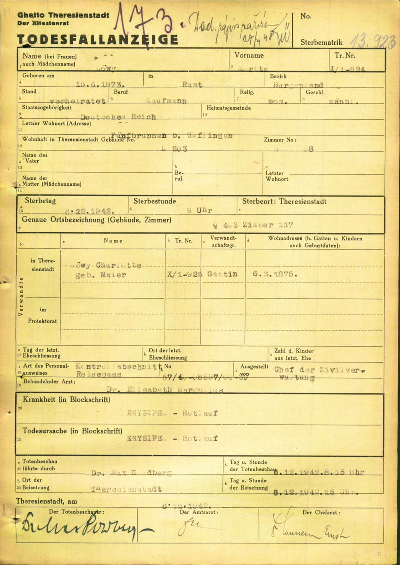 Löwy Moritz: Death certificate, Ghetto Terezín
