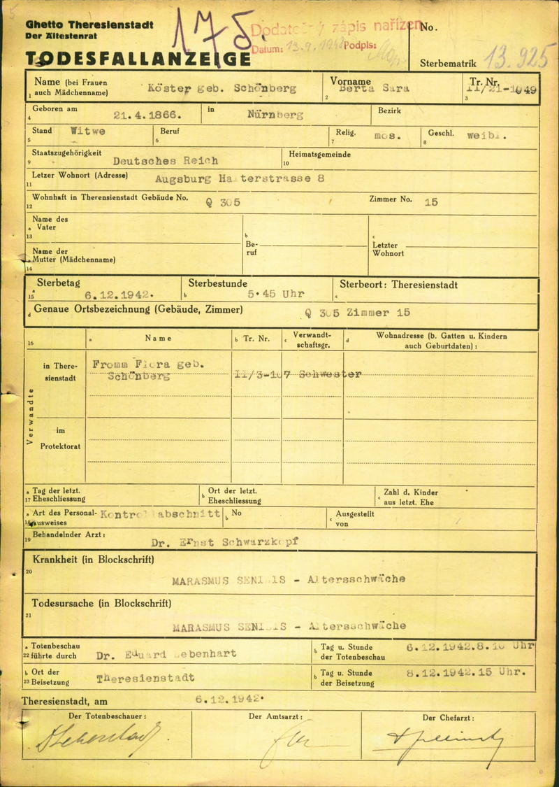 Köster Berta: Death certificate, Ghetto Terezín