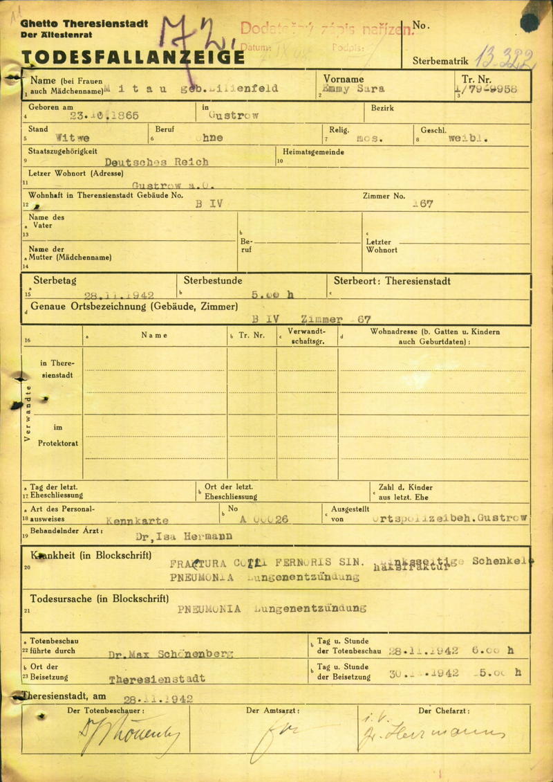 Mitau Emmy: Death certificate, Ghetto Terezín