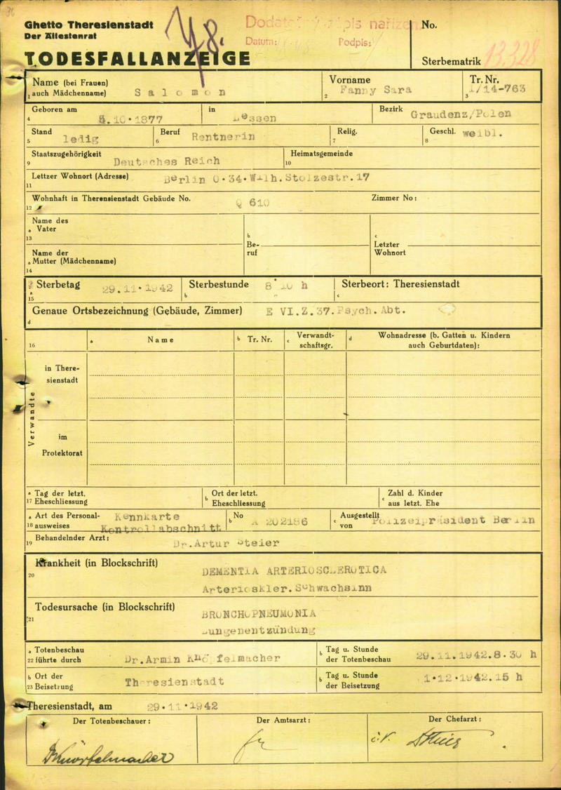 Salomon Franziska: Death certificate, Ghetto Terezín