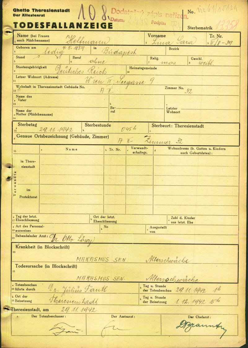 Helfmann Lina: Death certificate, Ghetto Terezín