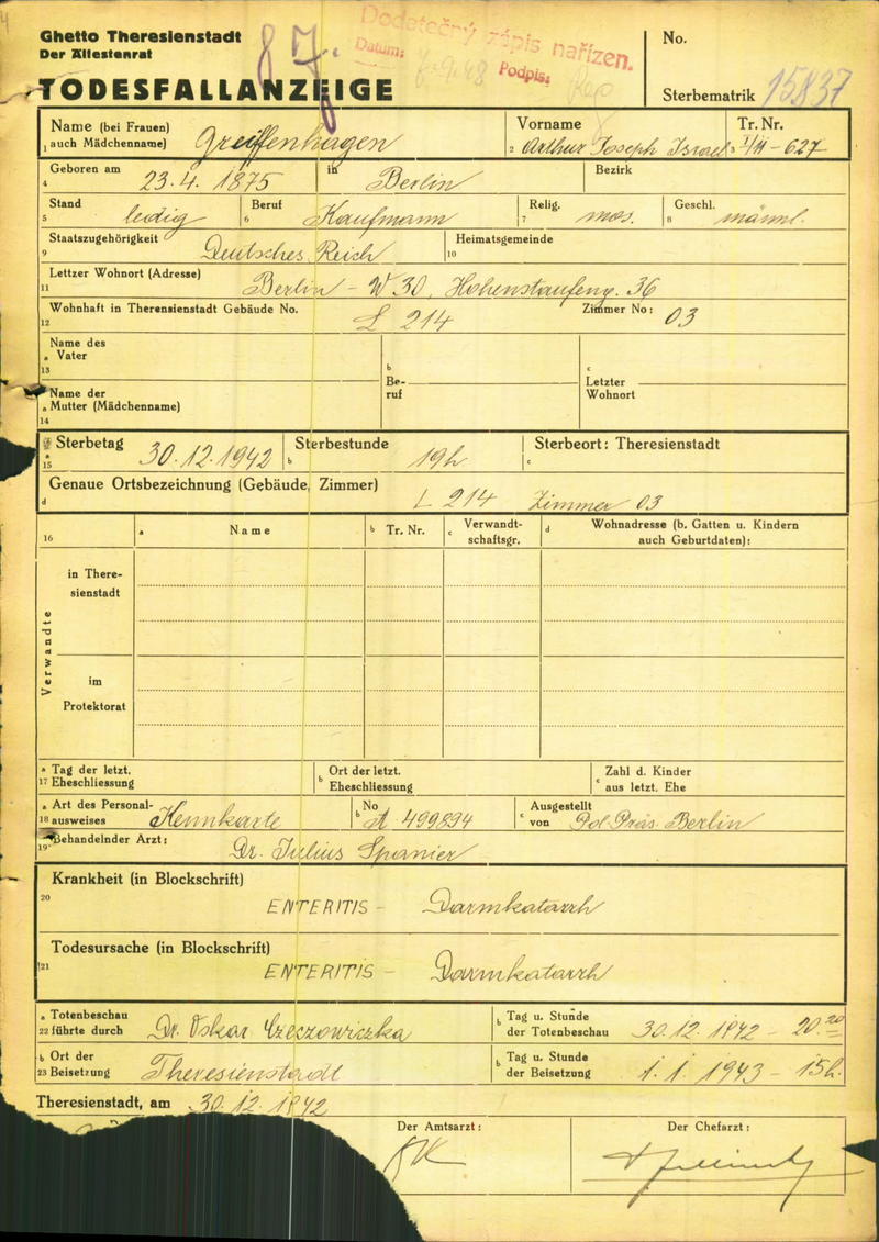 Greiffenhagen Arthur: Death certificate, Ghetto Terezín