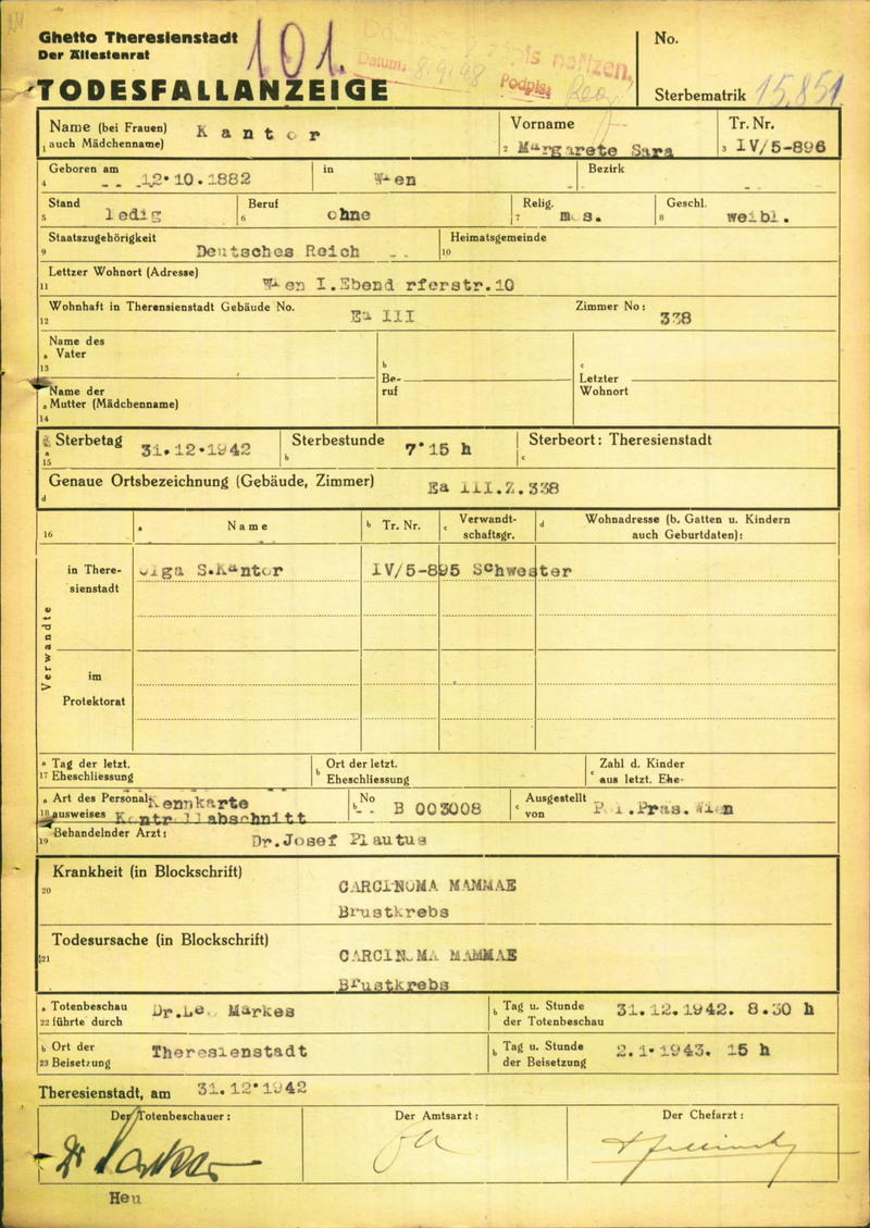 Kantor Margarete: Death certificate, Ghetto Terezín