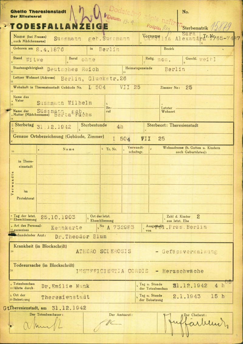 Süssmann Cäcilie: Death certificate, Ghetto Terezín