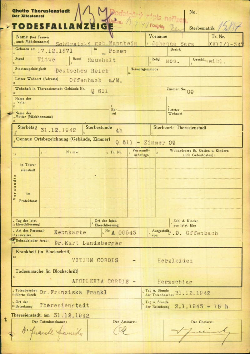 Schüratzki Johanna: Death certificate, Ghetto Terezín