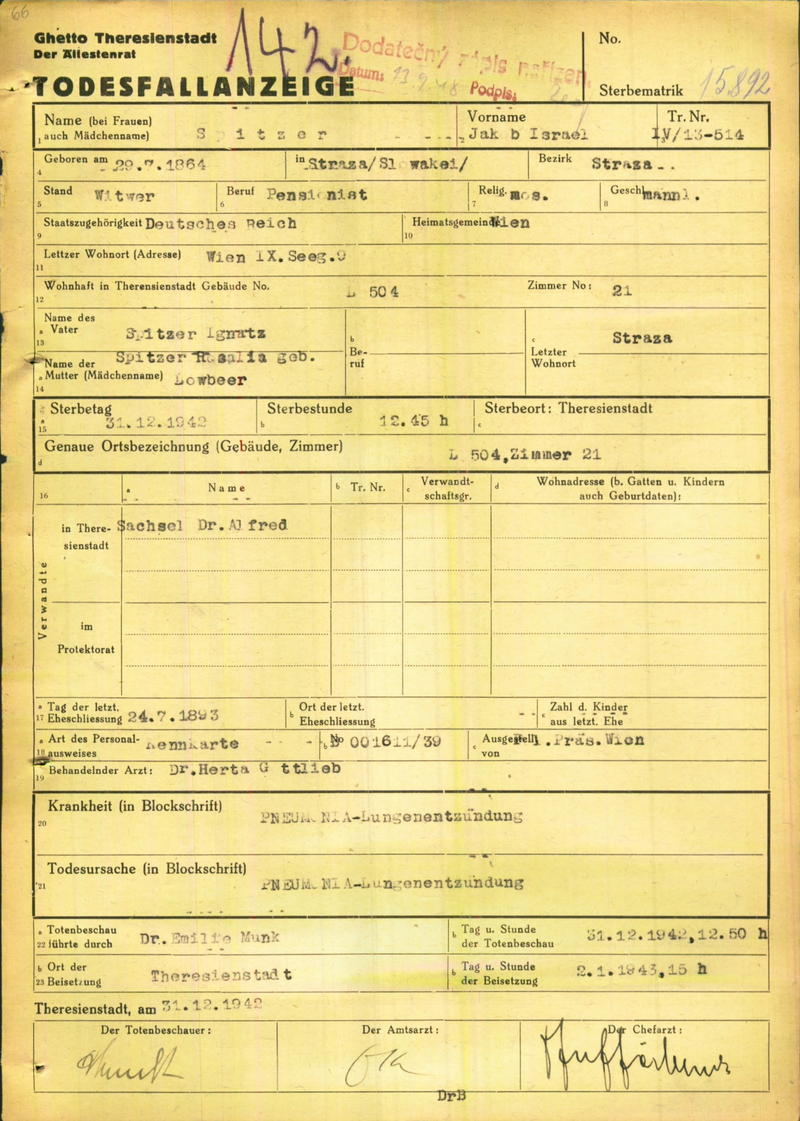 Spitzer Jakob: Death certificate, Ghetto Terezín