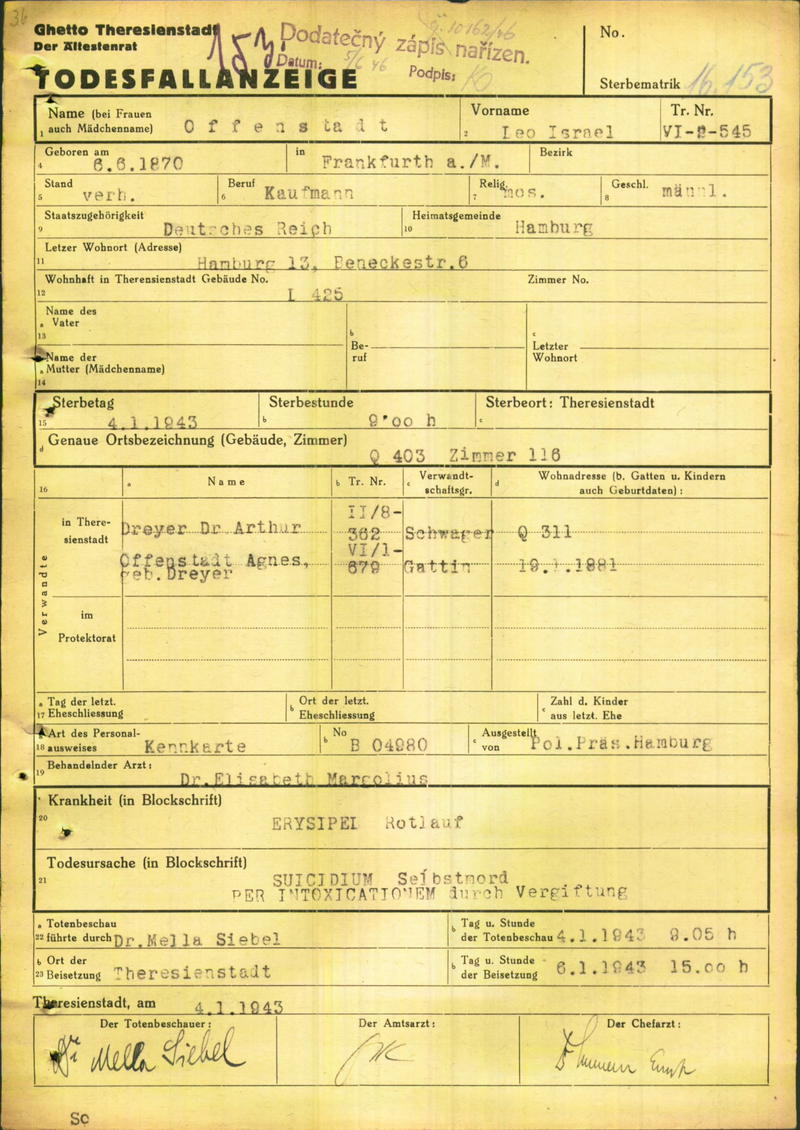 Offenstadt Leo: Death certificate, Ghetto Terezín
