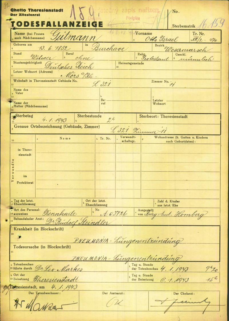 Guttmann Otto: Death certificate, Ghetto Terezín