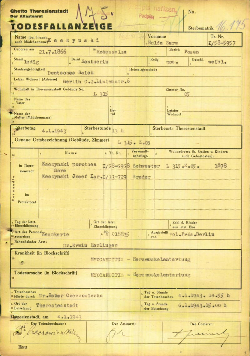 Kaczynski Hulda: Death certificate, Ghetto Terezín