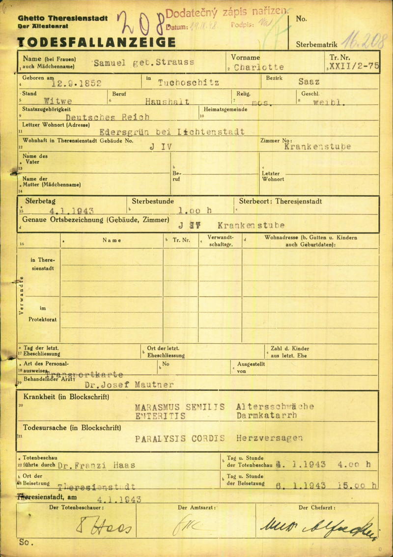 Samuelová Charlotte: Death certificate, Ghetto Terezín