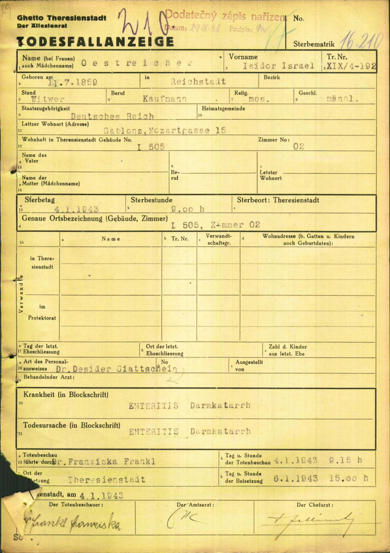 Östreicher Isidor: Death certificate, Ghetto Terezín