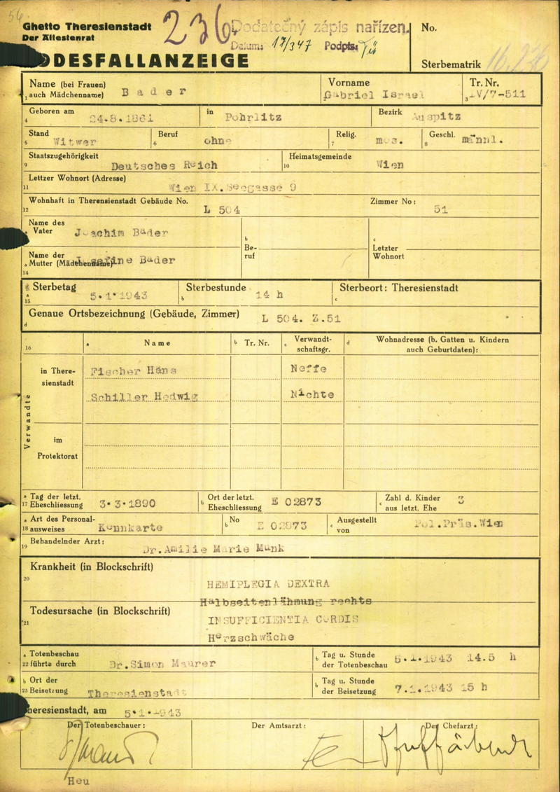 Bader Gabriel: Death certificate, Ghetto Terezín