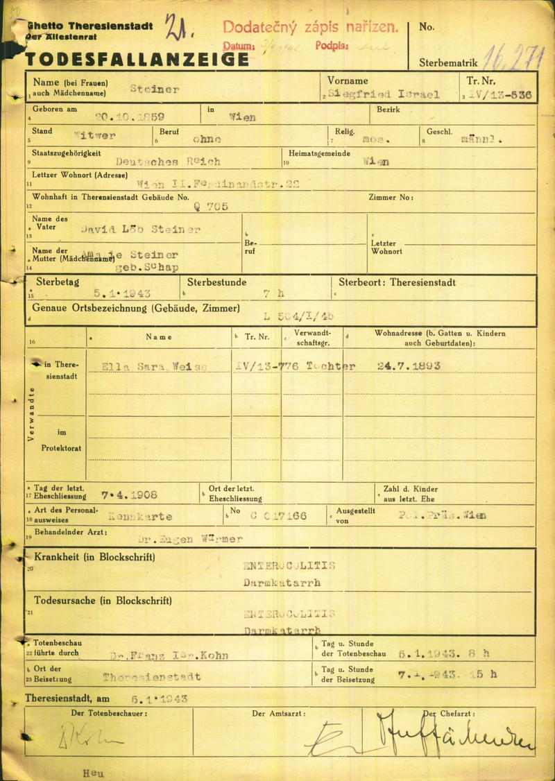 Steiner Siegfried: Death certificate, Ghetto Terezín